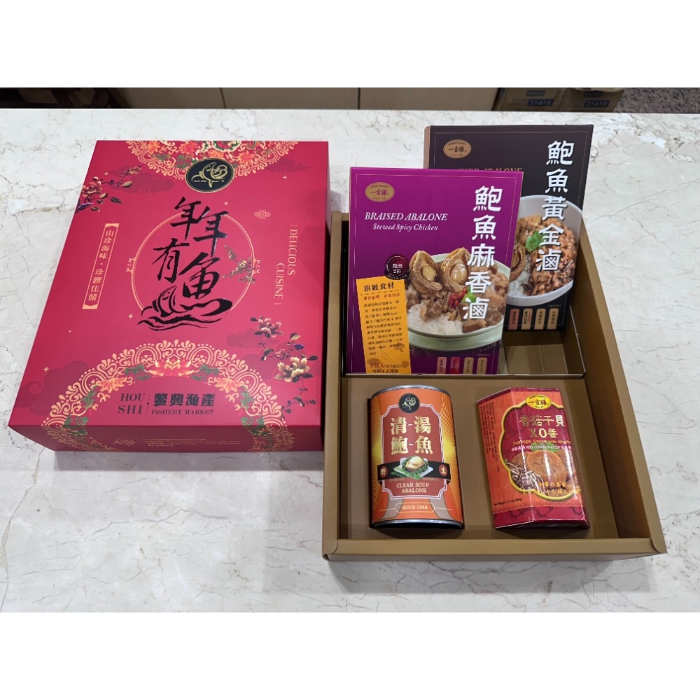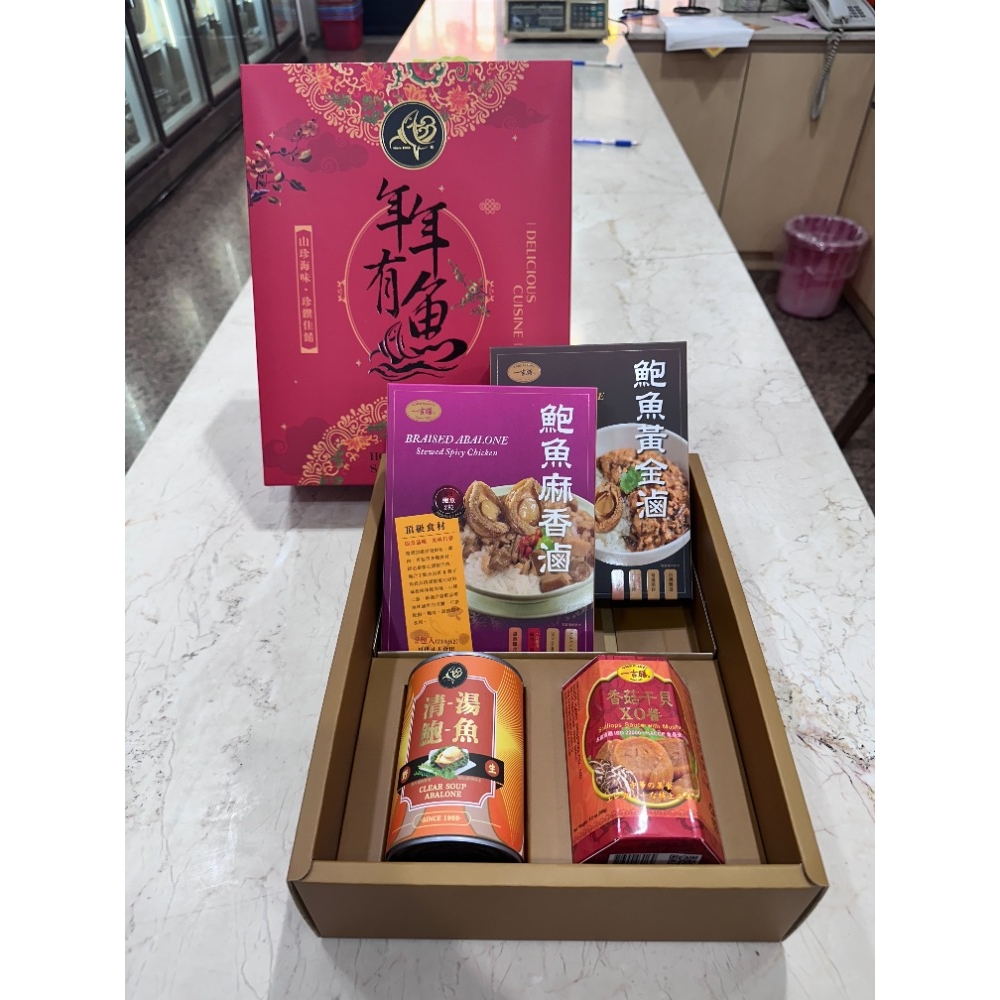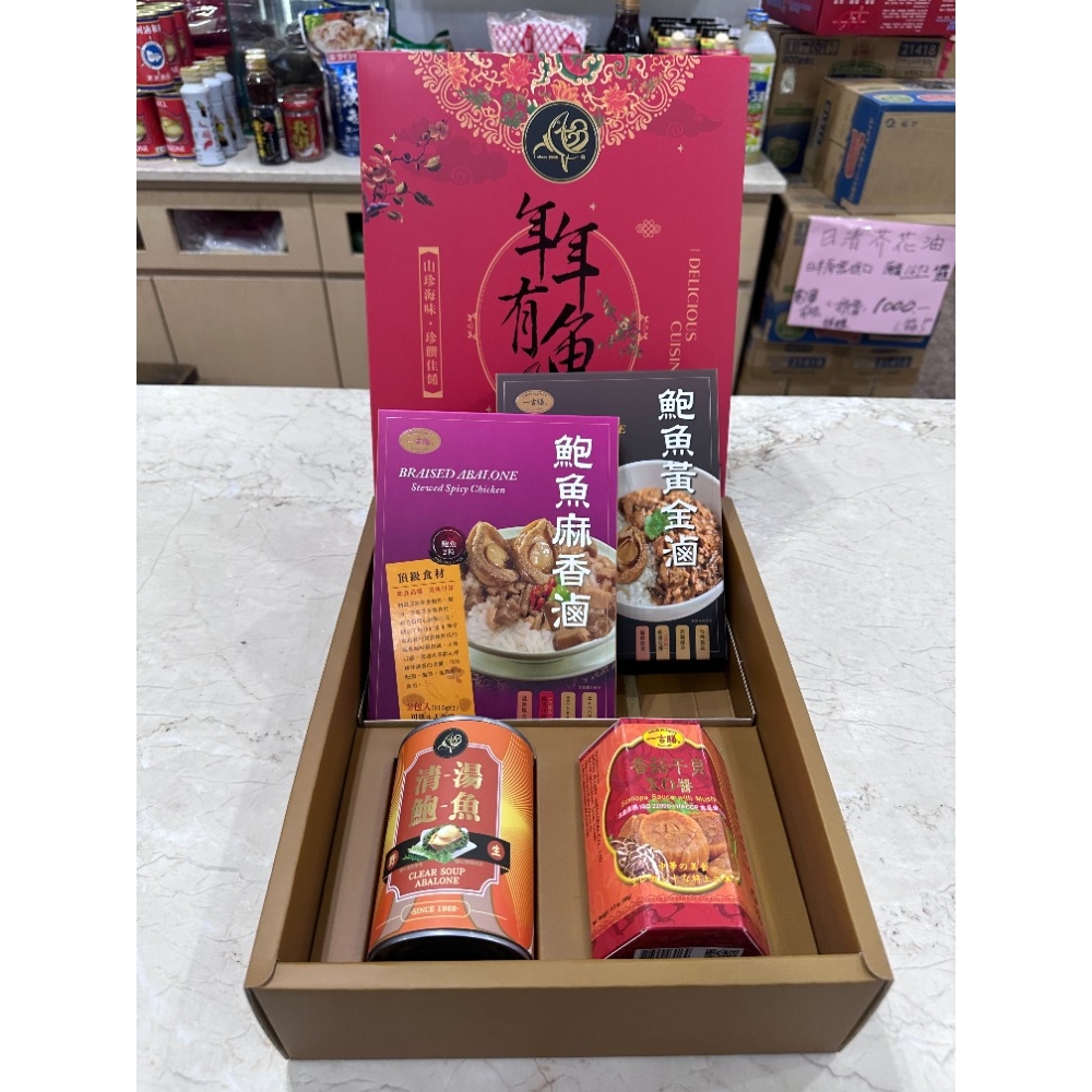 鮑魚麻香滷2包/盒、鮑魚黃金滷2包/盒、清湯鮑魚10粒、香菇干貝XO醬